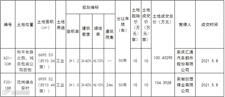 安庆市6宗土地使用权成功出让。宜秀区,天民路以西、宜秀大道以北庆自然出字〔2021〕016号地块使用权由安徽省经工建设集团有限公司竞得,规划用途为住宅用地。