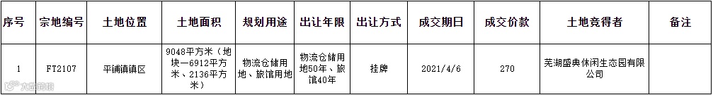 位于平铺镇镇区的物流仓储用地、旅馆用地,使用权由芜湖盛典休闲生态园有限公司竞得。