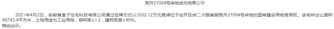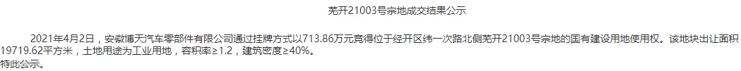 芜湖市有6宗土地使用权成功出让,2宗工业用地位于经开区,使用权分别由安徽博天汽车零部件有限公司和安徽省盒子住宅科技有限公司竞得。