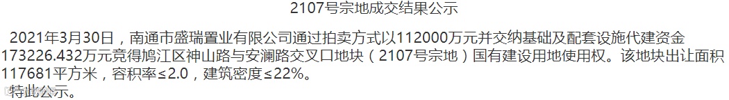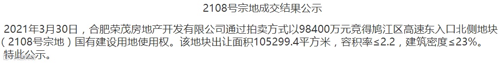 2宗居住用地位于鸠江区,使用权分别由南通市盛瑞置业有限公司和合肥荣茂房地产开发有限公司竞得。