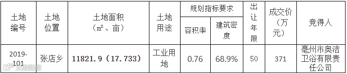 亳州市谯城区张店乡2019-101地块使用权成功出让,规划用途为工业用地,竞得者为亳州市奥洁卫浴有限责任公司。
