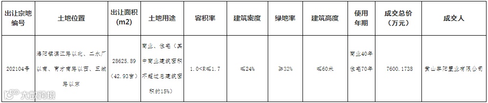 黄山市休宁县海阳镇滨江路以北、二水厂以南、育才南路以西、五城路以东202104号地块使用权由黄山率阳置业有限公司竞得,规划用途为商业、住宅(其中商业建筑面积不超过总建筑面积的15%)。