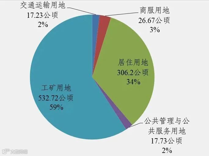 其中,居住用地38个地块、306.2公顷,商服用地10个地块、26.67公顷,交通运输用地8个地块、17.23公顷,公共管理与公共服务用地7个地块、17.73公顷,工矿用地57个地块、532.72公顷。