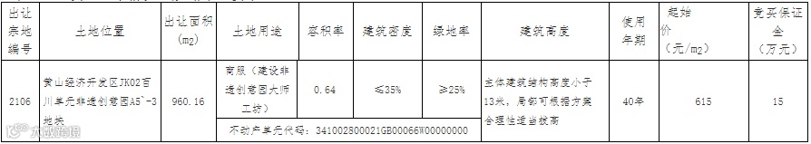 黄山市将挂牌出让位于黄山经济开发区JK02百川单元非遗创意园A5`-3地块的2106号地块使用权,规划用途为商服(建设非遗创意园大师工坊)用地,申请人须于6月25日前提交书面报名材料。