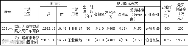 宣城市绩溪县将挂牌出让2宗工业用地使用权,申请人可于5月28日到6月25日下载出让文本,在线提出竞买申请,并交纳竞买保证金。