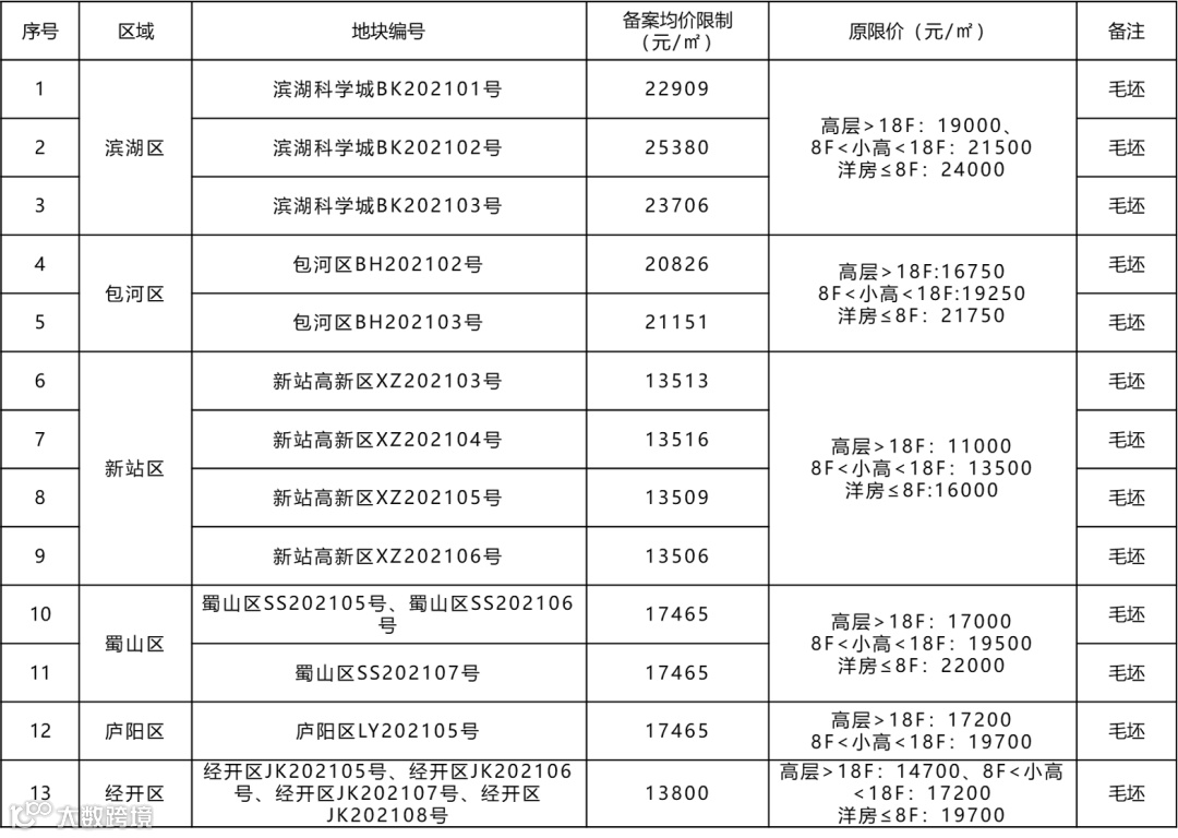 政策内容:合肥首次对地块出让设定了毛坯备案均价(如下表)