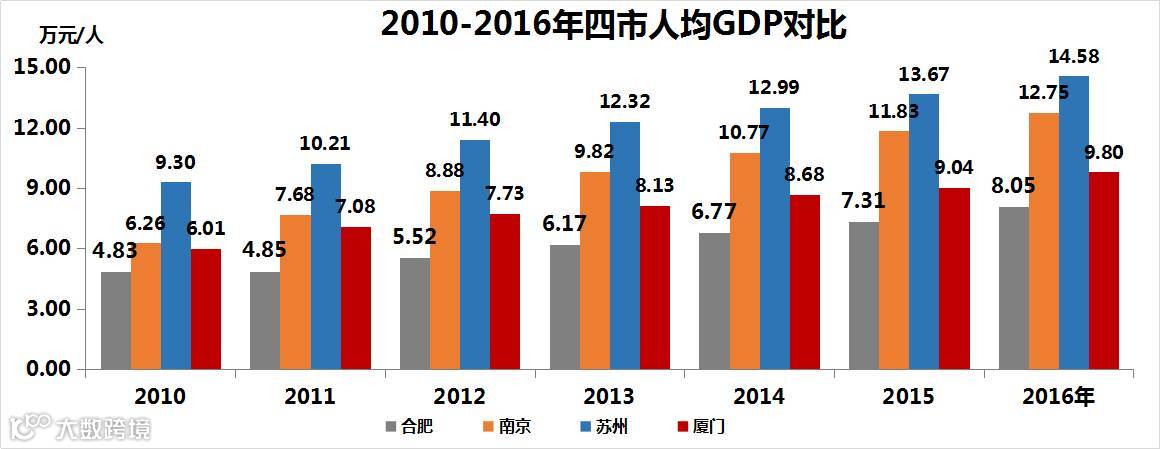 在2016年,苏州的人均GDP是14.58万元/人,同比增长6.63%,其次南京,人均GDP为12.75万元/人,同比增长7.79%,接下来就是厦门,人均GDP在9.80万元/人,同比增长8.47%,最后就是合肥的人均GDP为8.05万元/人,同比增长10.12%,但是其2016年的增长速度趋势最快的。