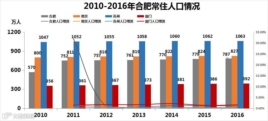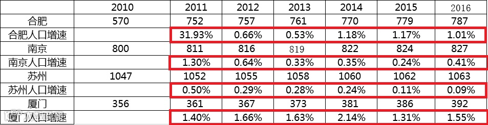 2016年苏洲常住人口达1063万人,人口增加了近1万多人,同比涨0.09%;其次是南京常住人口为827万人,比2015年增加3万多人,同比增长0.41%;合肥2016年常住人口为787万人,比2015年增加8万人,同比增加1.01%;最后的是厦门,常住人口为392万人,比2015年增加6万人,同比增速为1.55%。