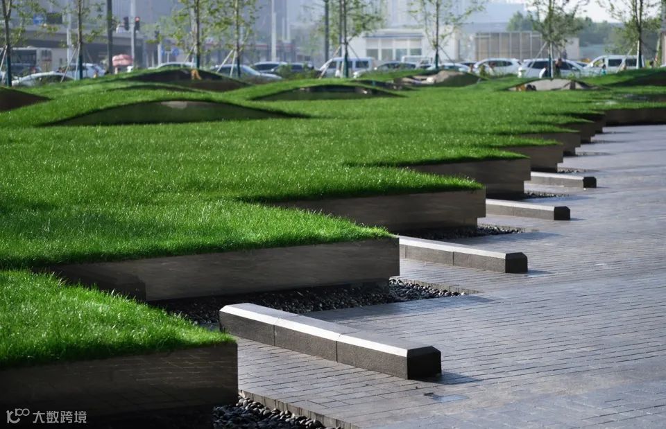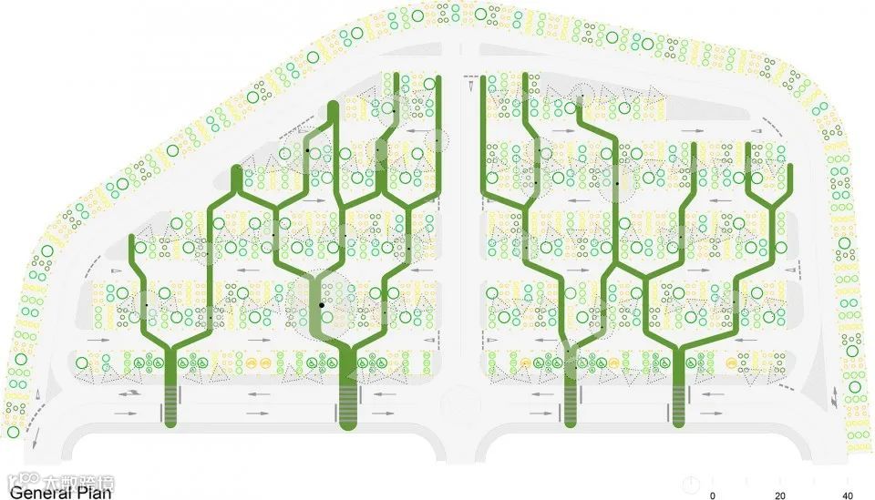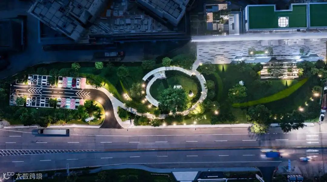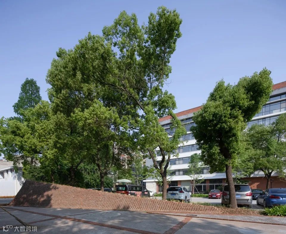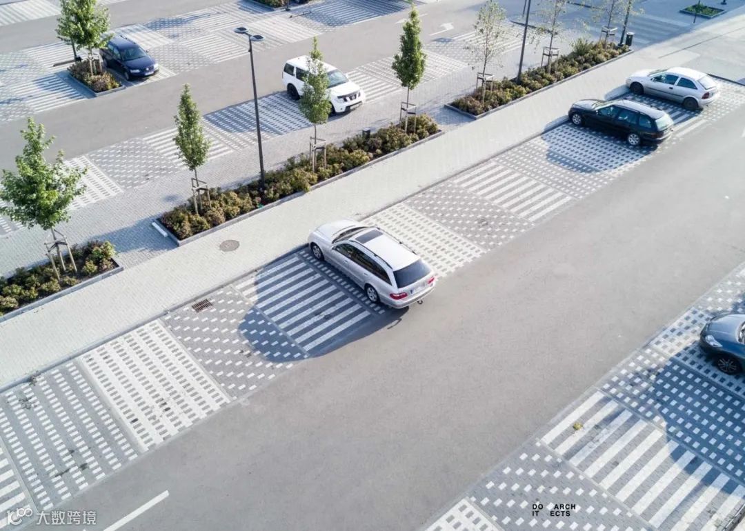 ▼停车场中的树木被保留,绿色为人行步道
