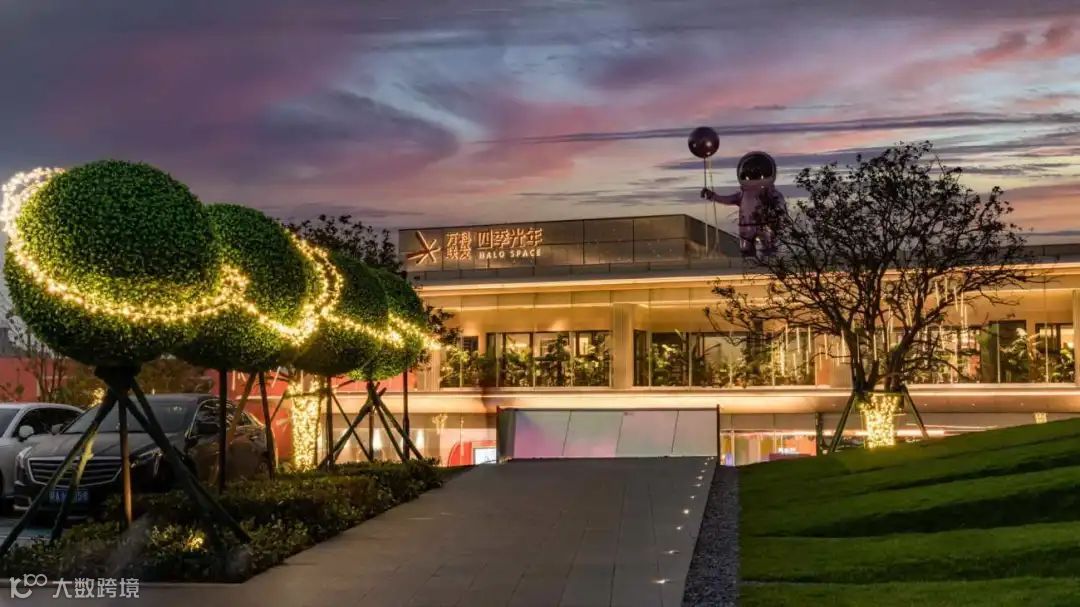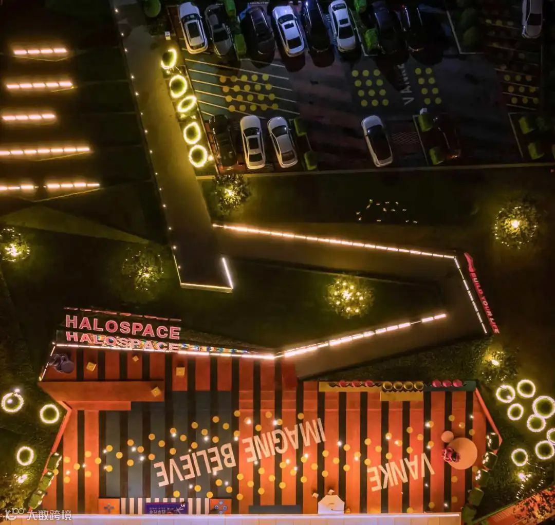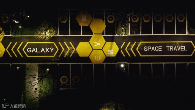 入口即开始,沿车行道路一直延伸至停车场的地面几何及文字图案,贯穿整个展示区,指引人们去探索“星海”,探索未知的奥秘,一起发现未来新的社区生活模式。