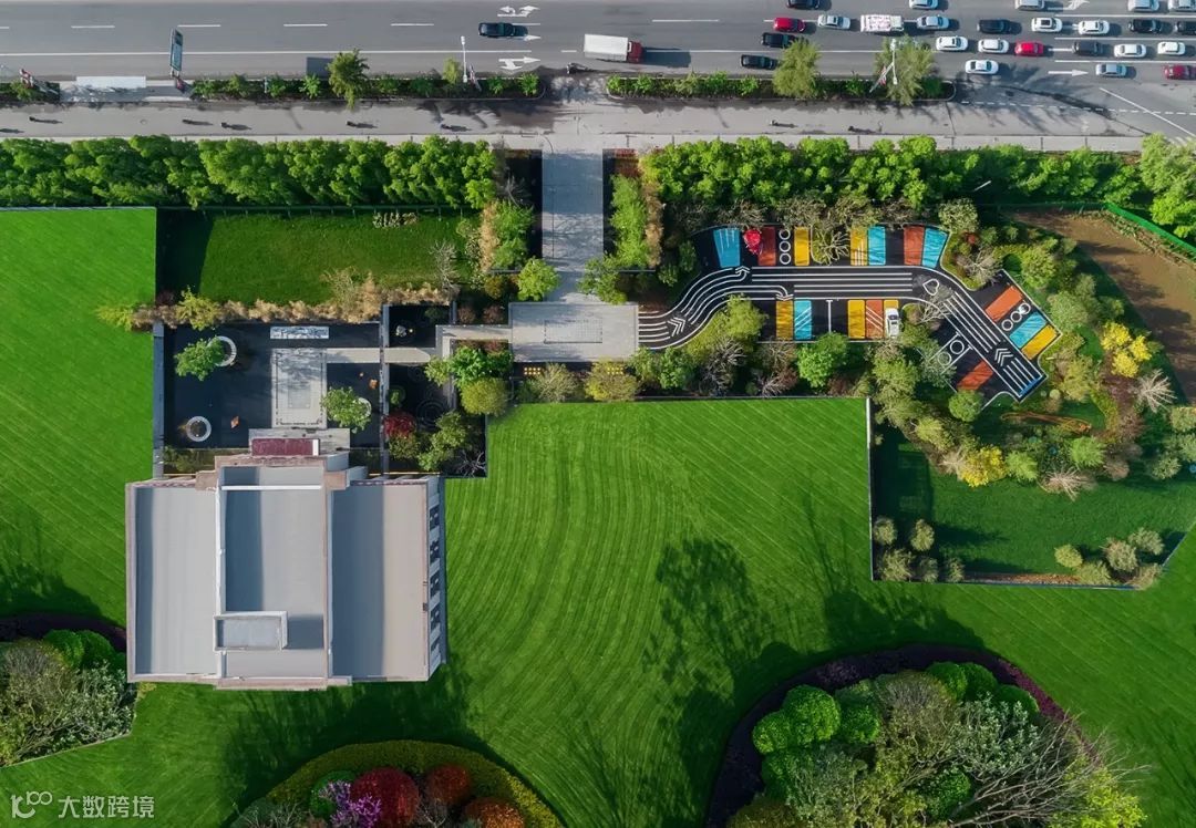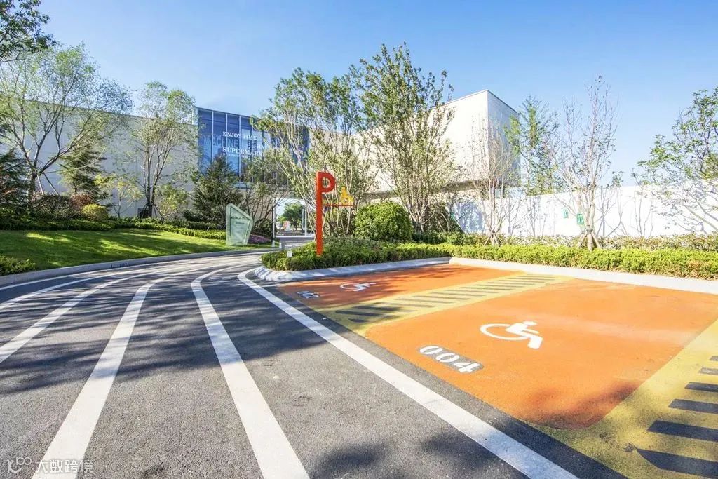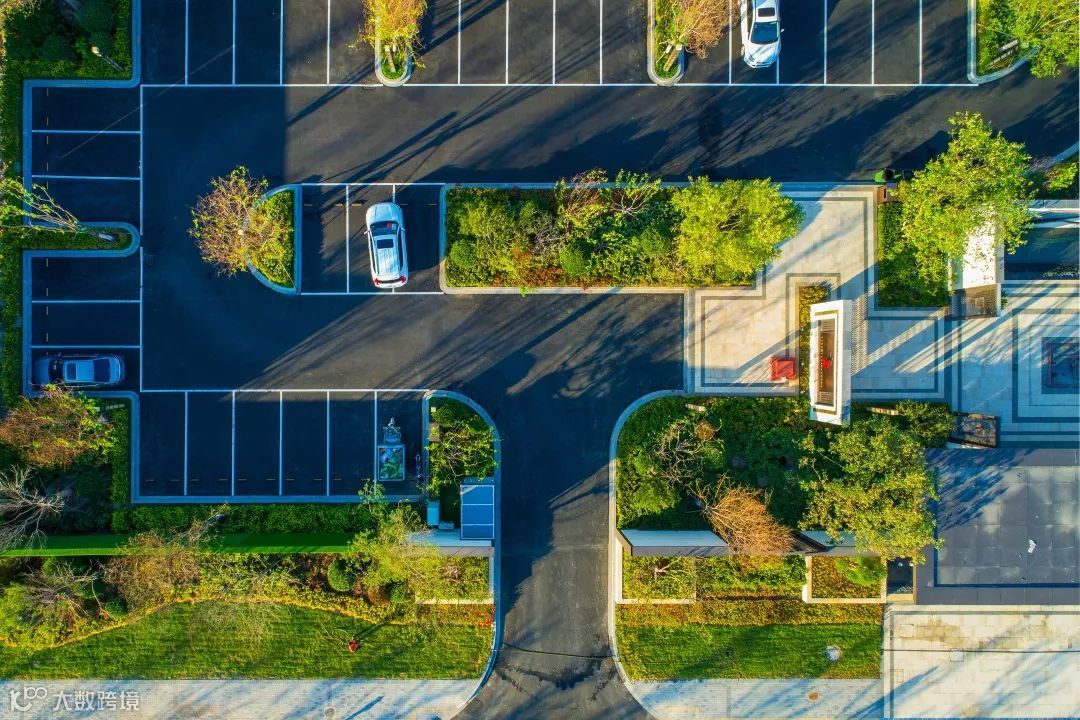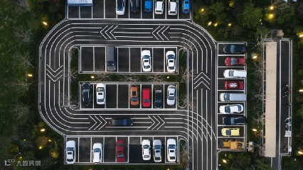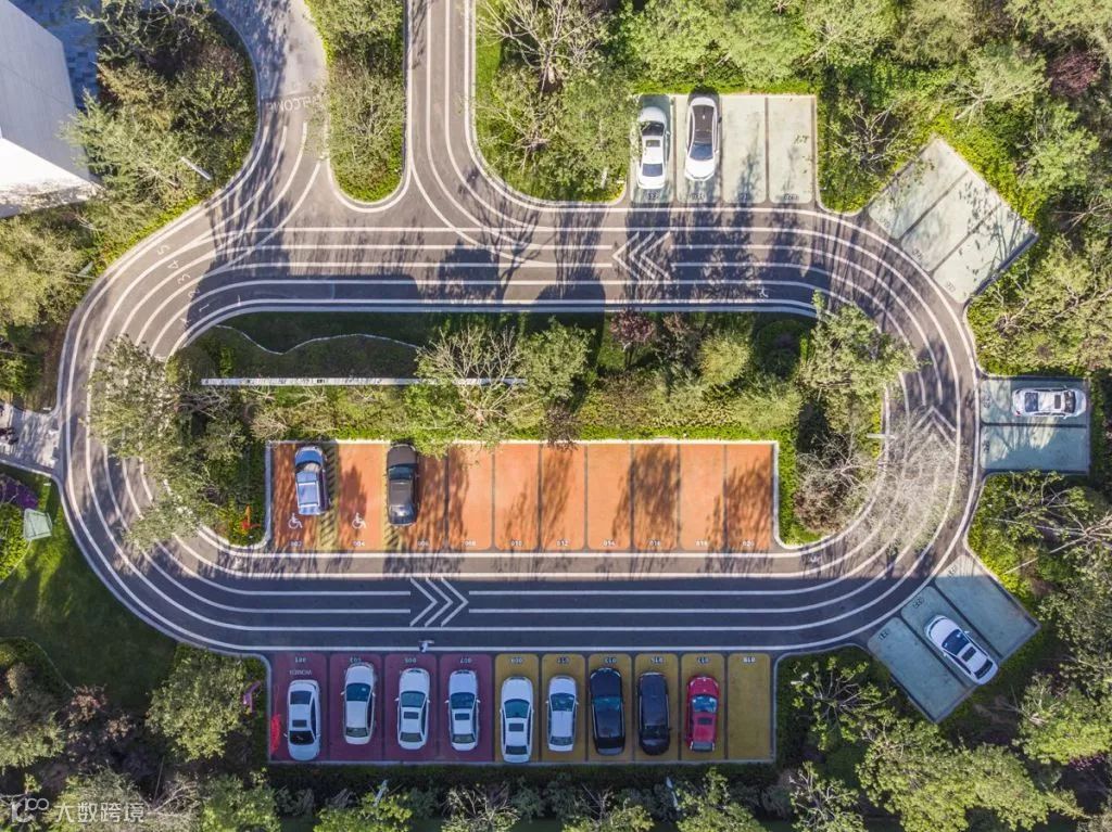 停车场的设计,简约而规整,种植错落有致,飞起来看很有小清新的感觉。简单而醒目的行车标识,让停车更加easy,不同尺寸的车位设置可满足不同大小的车辆停放需求。