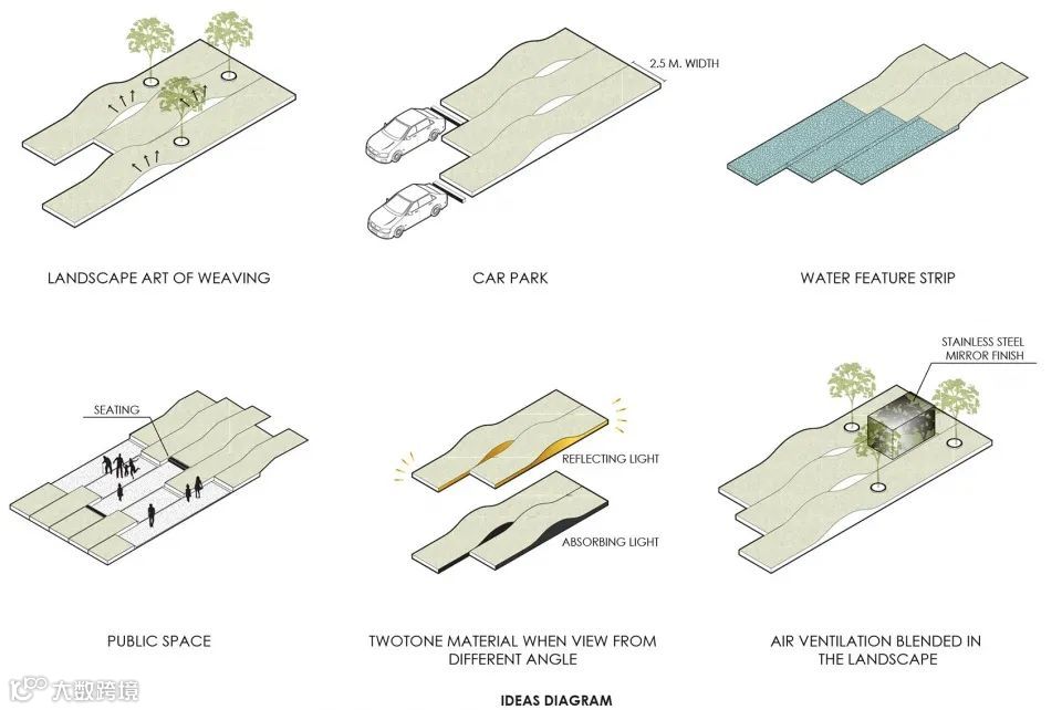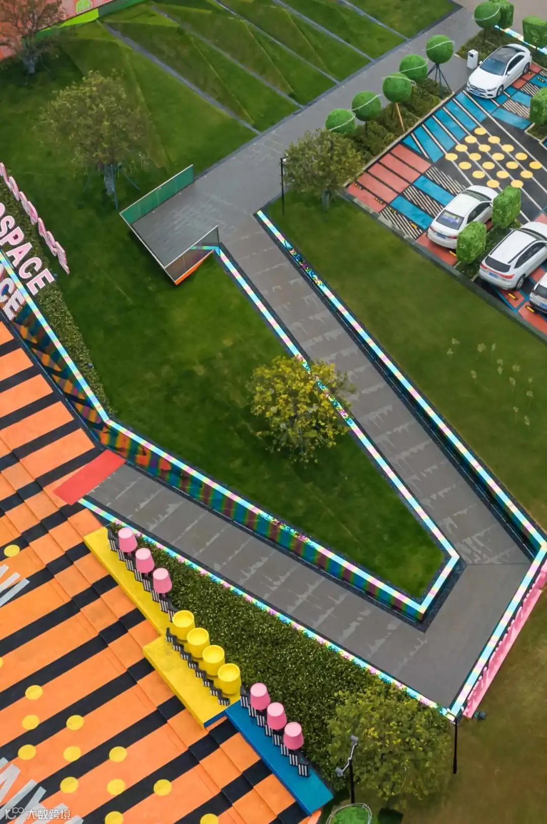 为了打造不一样的停车场空间,跳出常规,为停车场注入不一样的视觉效果。白色的导向性线条,活力的撞色搭配,不同形状的组合都增加了景观空间的趣味性,区别于一般普通停车场的单调刻板。