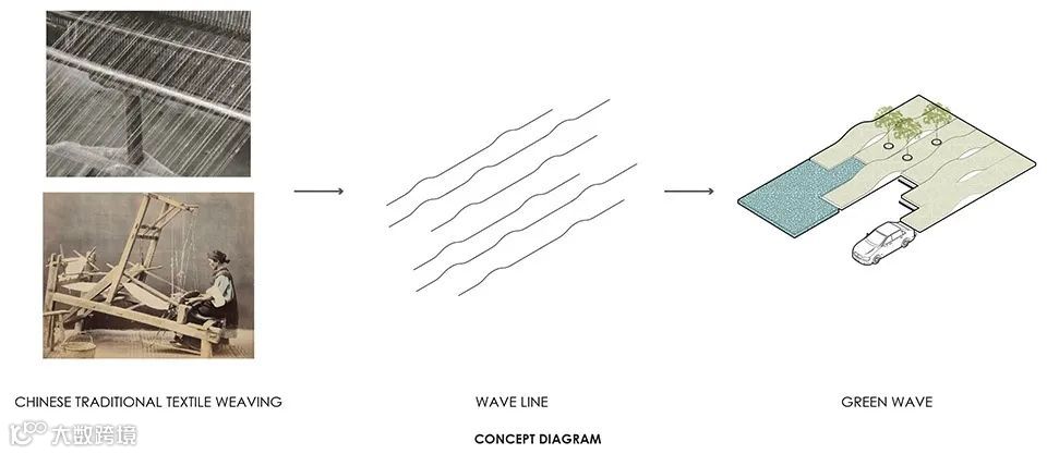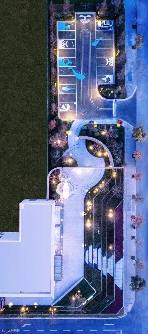 在场地北侧,设计师使用现有的车行入口,地面的彩色线条作为引导,停车场地面图案则作为海洋元素演绎的开端。