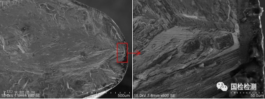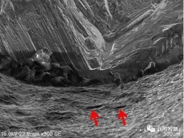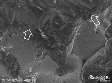 图4给出了源区存在疏松的断口微观形貌特征,从图上可以看出,裂纹起始于疏松边缘,源区外表面未见横向微裂纹,图4b箭头处可见锯齿状断面滑移特征。