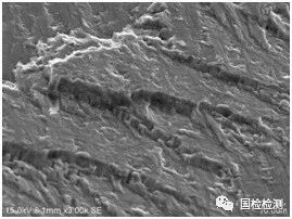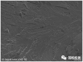 101件振动疲劳断口均存在第Ⅱ阶段扩展区,但这个阶段形成的断口形貌特征与第Ⅰ阶段不同,主要表现为宏观上断面平整,与叶片径向垂直,微观上可见细密的疲劳条带特征,第Ⅱ阶段扩展区微观形貌特征如图6所示。