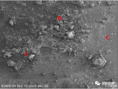 截取红框所示区域进行能谱分析,低倍形貌如图3所示,可见表面存在明显的腐蚀产物。为便于进一步分析,将表面分为3个区域,其中A、B两区为腐蚀区域,C区为完好区域。