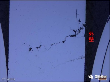 试样芯部金相组织、化学成分、硬度试验等均未发现异常。试样外表面存在明显的点状腐蚀,经能谱扫描,腐蚀产物除基体元素外存在大量的O元素及微量的S、Cl等腐蚀性元素。试样纵向金相组织可见明显的裂纹缺陷,裂纹扩展方式主要以穿晶为主,并存在大量分支裂纹,裂纹形态呈树枝状分布,裂纹扩展方向与外壁所受拉应力方向垂直,由此可以判断裂纹类型为应力腐蚀裂纹。