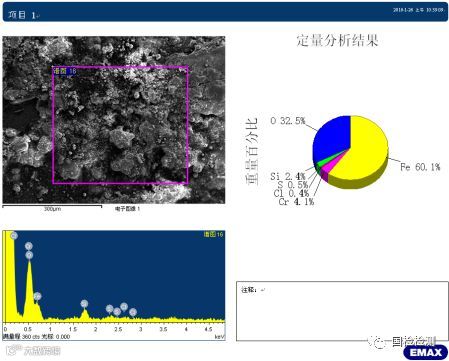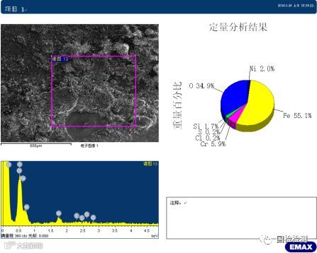 图4、图5所示分别为A、B两区能谱分析结果,腐蚀产物均含有大量的O元素及微量的S、Cl元素。