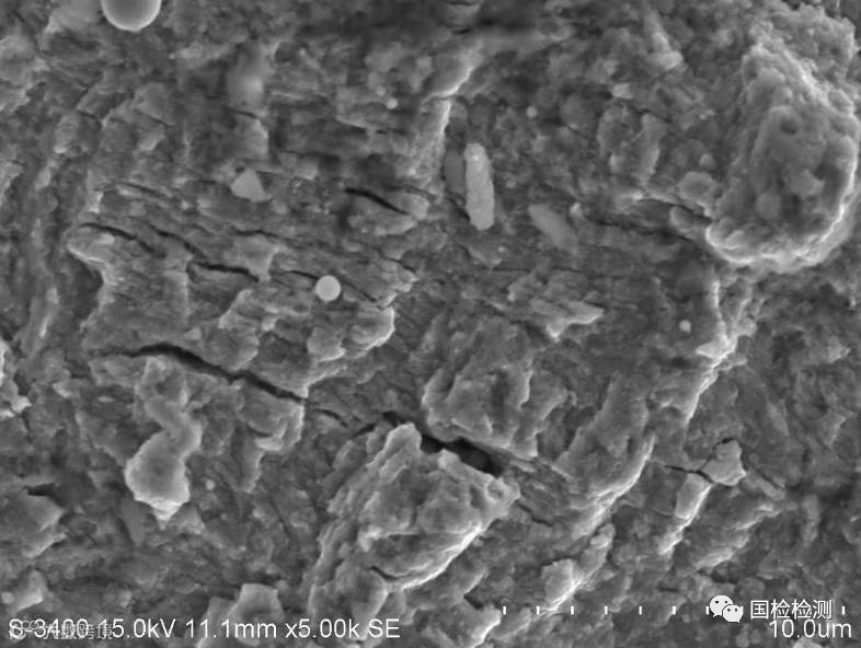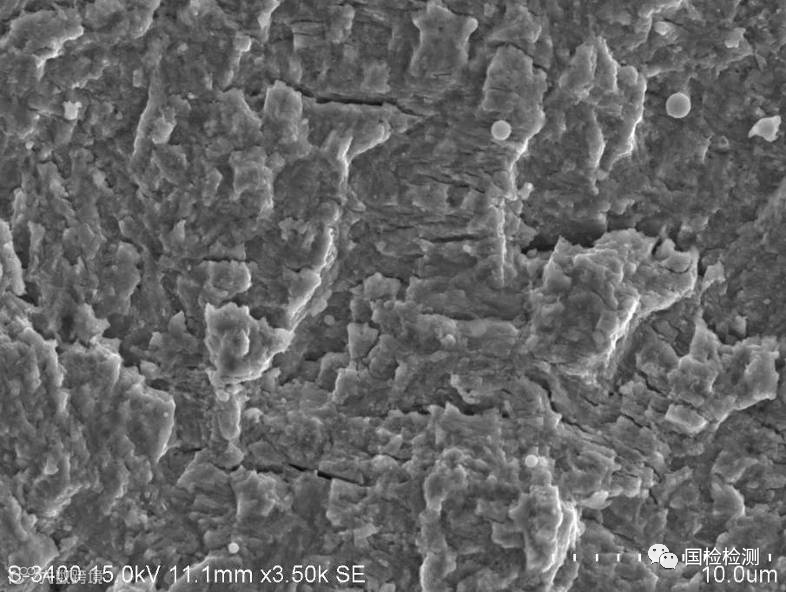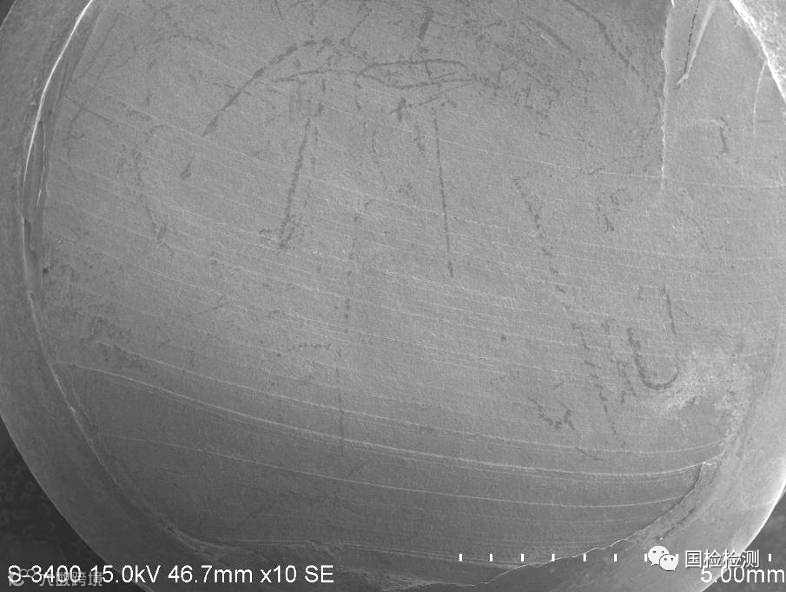 图11-131所示为断面扫描电镜低倍形貌,可见明显的疲劳弧线,占整个断面积的80%以上,呈现典型的疲劳断裂特征。
