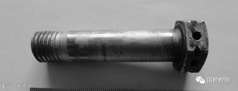 断裂件检查,螺栓在螺纹处断裂(图中左侧);螺栓头下与杆部多处有明显的磨损痕迹,一侧较严重(图中右侧),见图11-128。