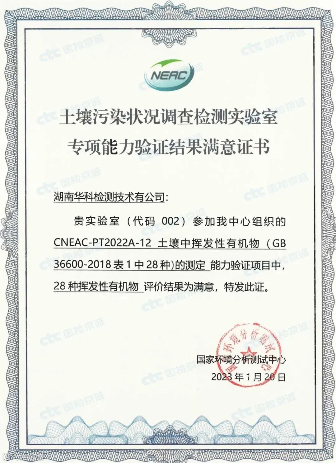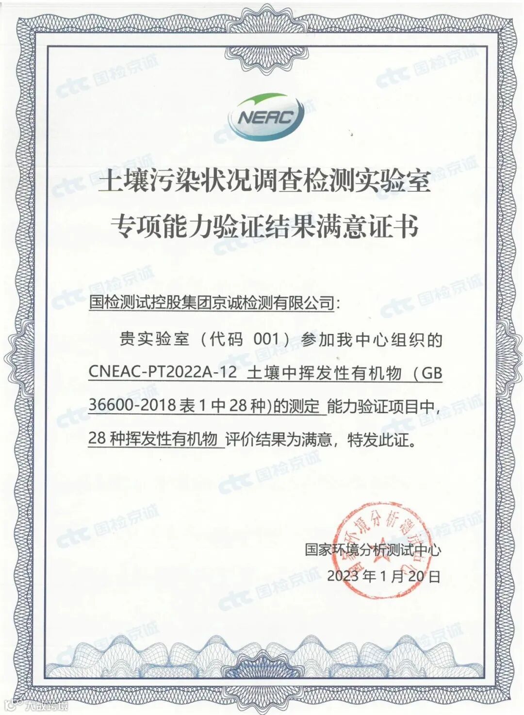 近日,国检京诚集团广州公司、湖南公司顺利通过CNEAC-PT2022A-12土壤中挥发性有机物(GB 36600-2018表1中28种)项目能力验证考核,并获得“满意”结果!
