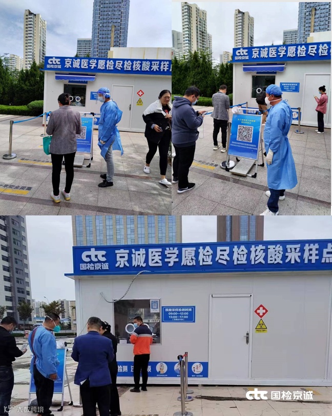 国检京诚青岛医学实验室组织 70 余人员工参加十一期间4 次青岛市黄岛区大规模核酸检测工作,正常安排食品医学事业部核酸采样、检测等值班工作,在金石、保税区、辛安、京诚园区愿检尽检采样仓为群众提供核酸检测采样服务。