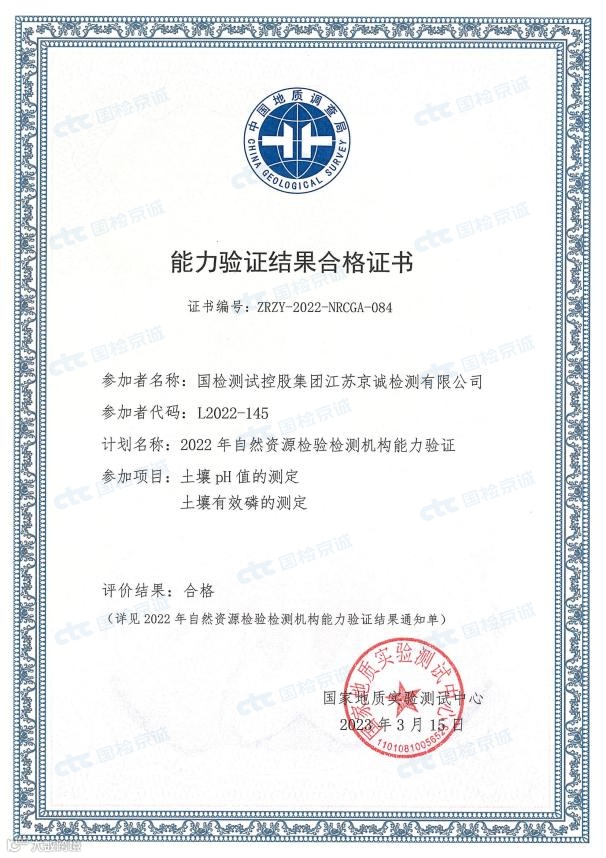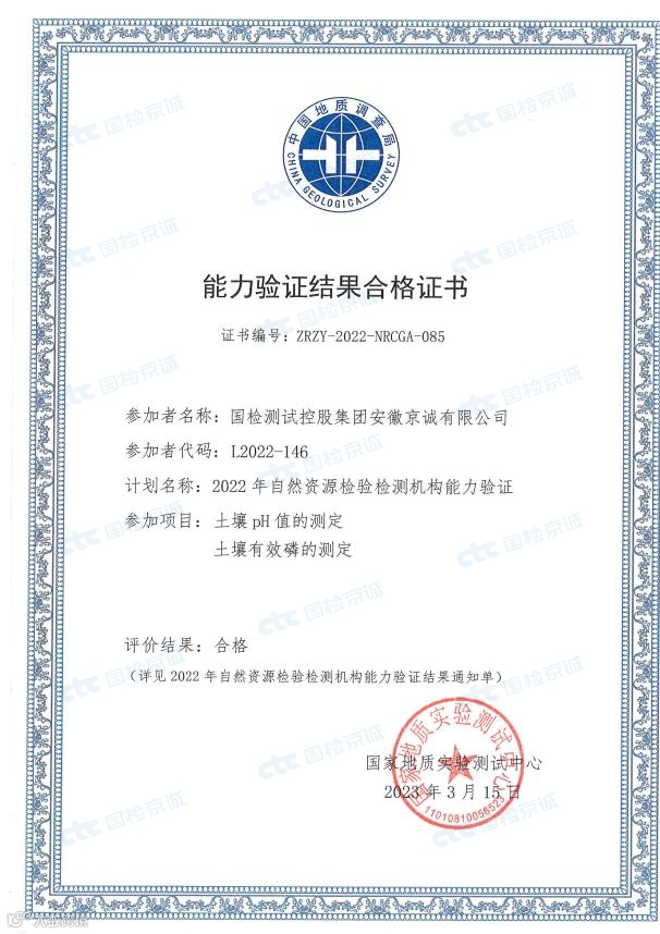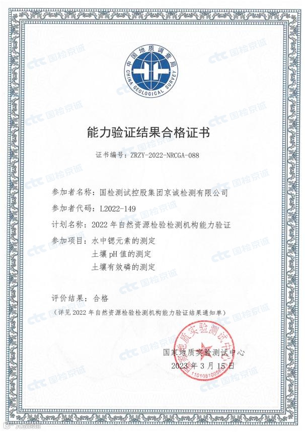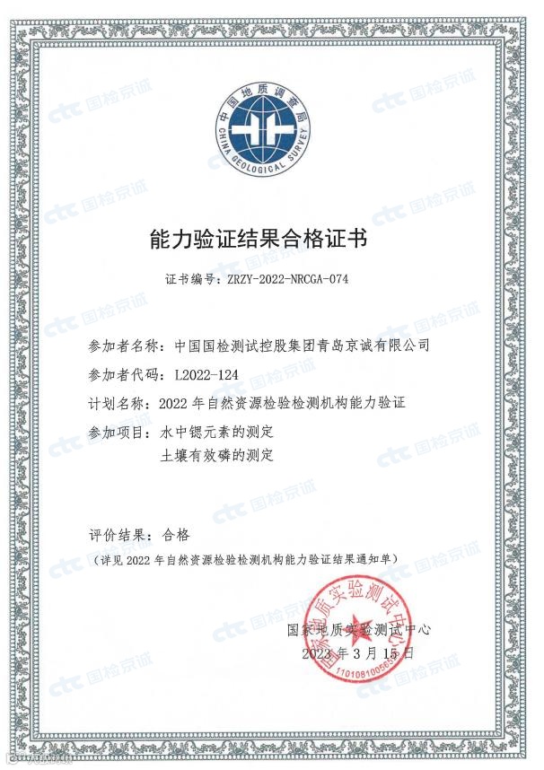 近期,国检京诚集团多个实验室收到了2022年自然资源检验检测机构能力验证结果合格证书,通过了“海水中化学需氧量”、“海水中油类”、“海洋浮游植物种类和数量”、“水中锶元素”、“土壤pH值”、“土壤有效磷”的考核,取得“合格”成绩。