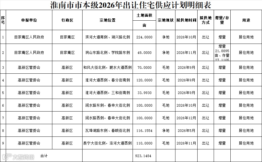 淮南市市本级2026年出让住宅供应923.15亩居住用地,在楼市深度调整、城市发展进入新阶段的今天,土地供应是解读城市发展方向、预判未来价值板块的关键钥匙。