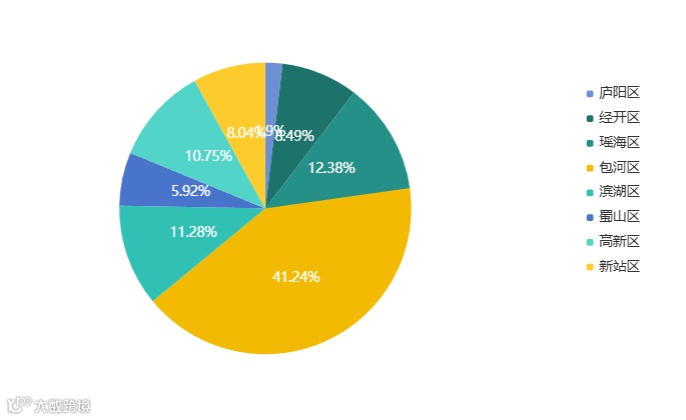 分区域来看,包河区成交面积占比41.24%,九区排名第一。瑶海区成交面积占比12.38%,排名第二。滨湖区成交面积占比11.28%,排名第三。
