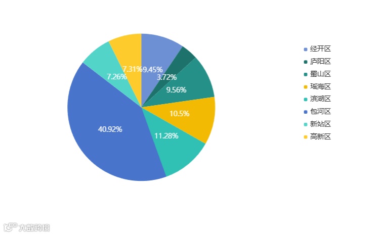 分区域来看,包河区成交面积占比40.92%,九区排名第一。滨湖区成交面积占比11.28%,排名第二。瑶海区成交面积占比10.5%,排名第三。