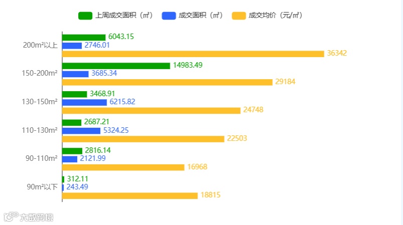 从成交面积段来看,本周成交面积段130-150m²以上的占比最大。