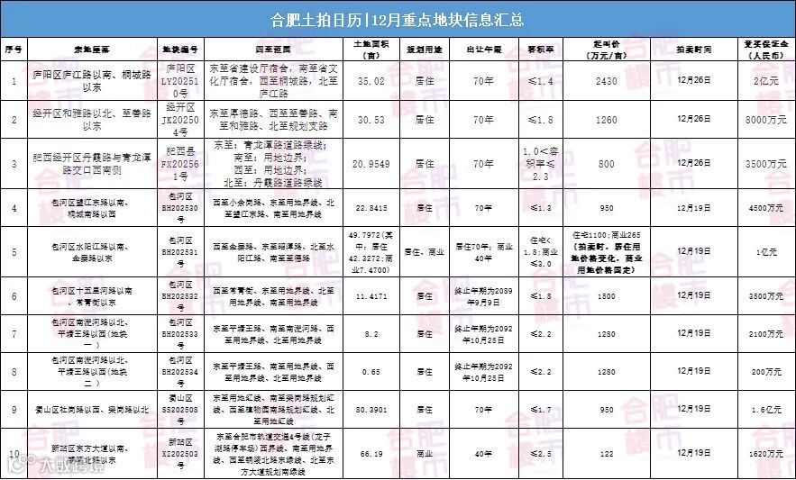 12月,合肥市共有两场土地拍卖会,出让10宗涉宅用地,出让日期分别为12月19日和12月26日。其中,12月19日出让包河、蜀山等7宗地块,12月26日出让庐阳区、经开区、肥西县各一宗居住用地。