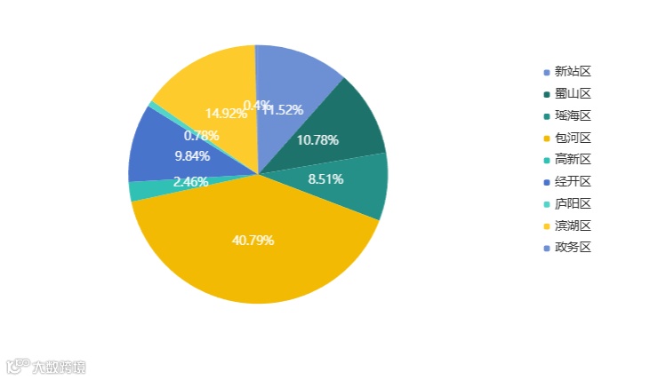 分区域来看,包河区成交面积占比40.79%,九区排名第一。滨湖区成交面积占比14.92%,排名第二。蜀山区成交面积占比10.78%,排名第三。