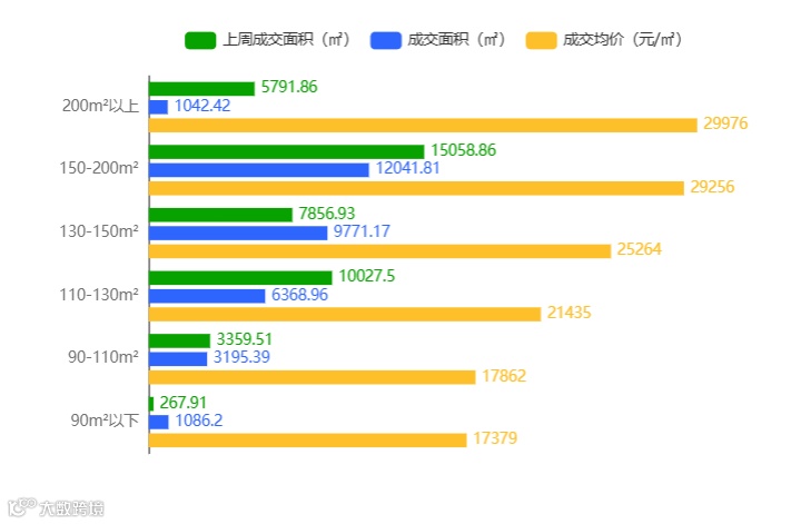 从成交面积段来看,本周成交面积段150-200m²以上的占比最大。