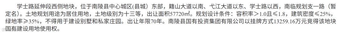 本次成交的地块位于南陵县中心城区东部核心区域,具体四至范围为:籍山大道以南、弋江大道以东、学士路以西,南临规划支一路。地块总面积57720平方米(约86.58亩),规划用途为纯居住用地,土地级别评定为十三等,出让年限70年。