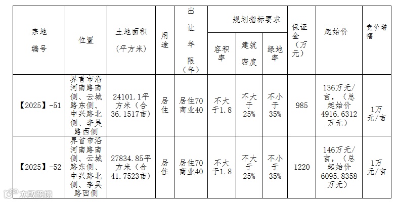 2025年10月14日,界首市自然资源和规划局发布两宗居住用地挂牌公告。地块编号【2025】-51与【2025】-52均位于沿河南路南侧、云城路东侧,总面积约77.9亩,容积率均控制在1.8以下,将建设低密度宜居社区。两宗地块起始价分别为136万元/亩和146万元/亩,竞买保证金合计2205万元,拟于11月6日公开拍卖。此次推地是界首市落实年度供地计划、优化城市空间布局的重要举措。