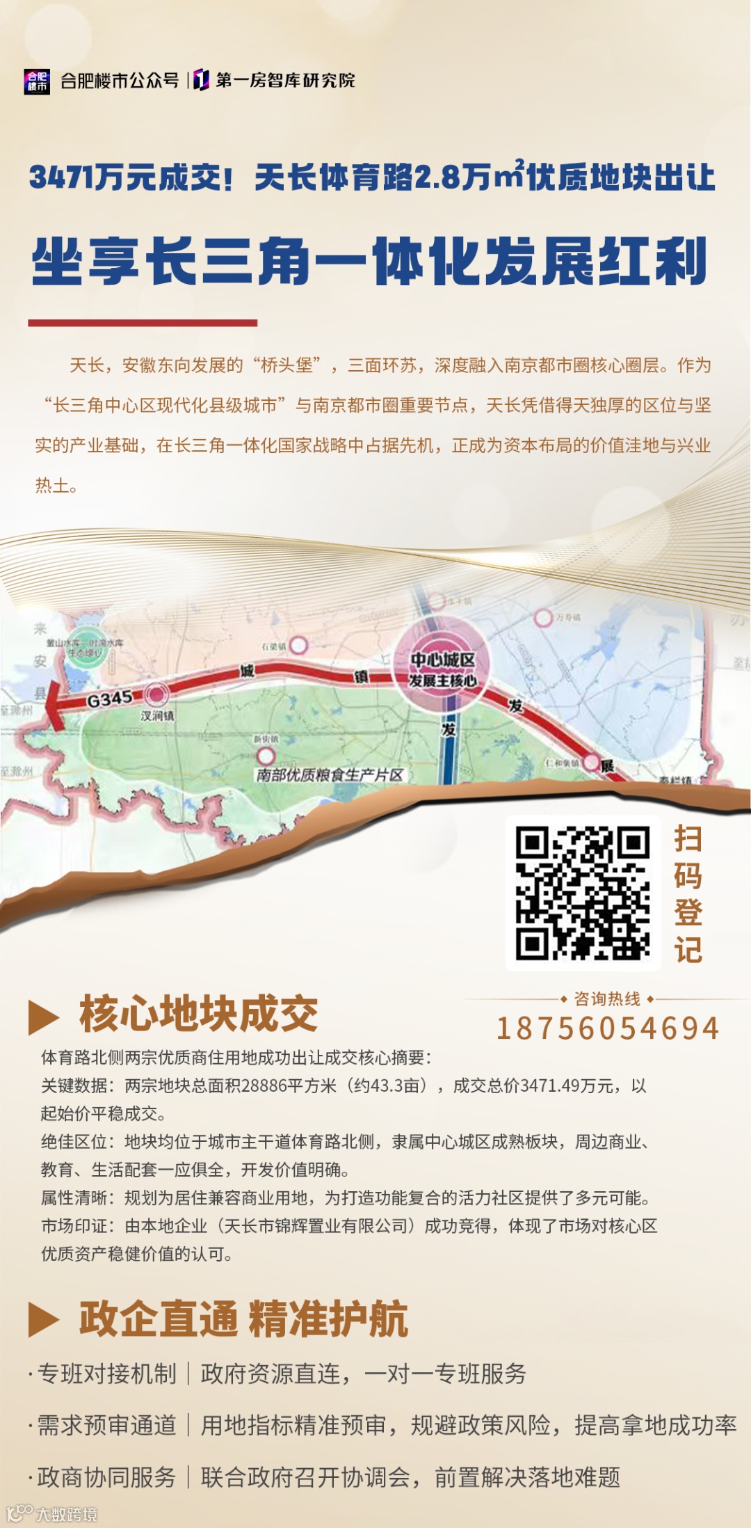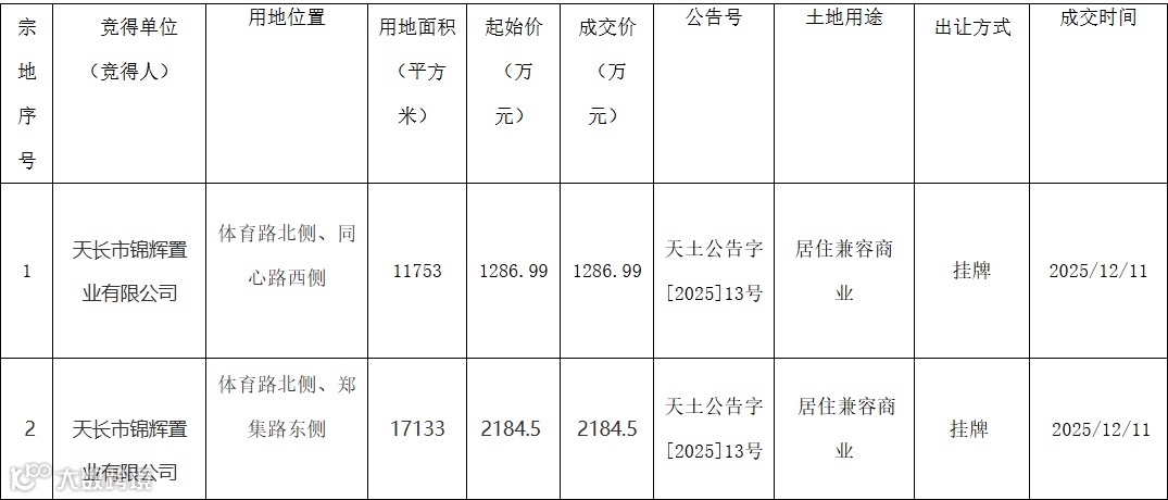 2025年12月11日,天长市土地市场迎来年末重磅交易!体育路北侧两宗优质商住用地总面积28886平方米,以总价3471.49万元全部底价成交。这一数据在当前土地市场中颇具深意,既反映了市场理性回归的态势,更预示着天长在长三角一体化背景下的投资价值重估。