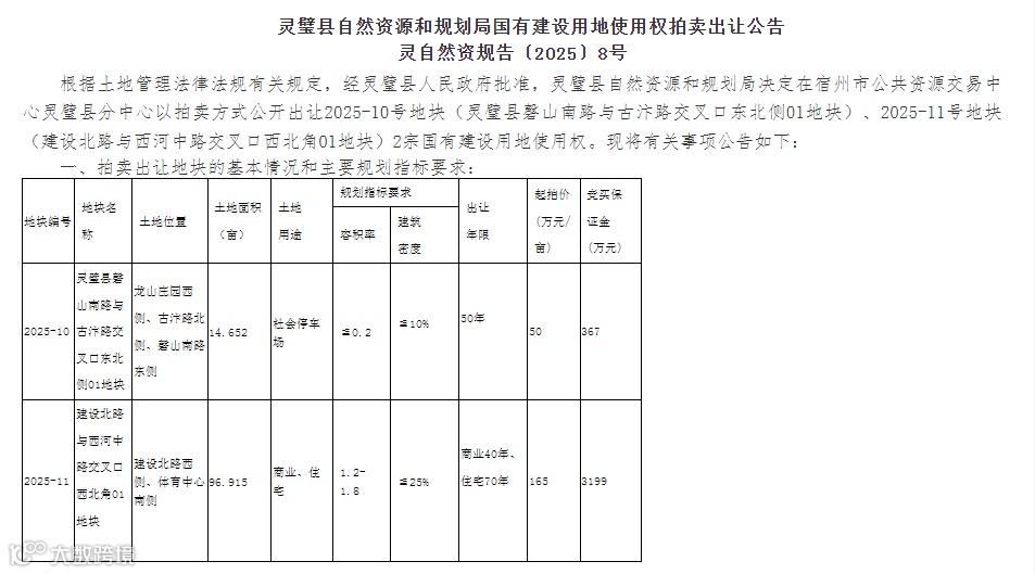 9月16日,灵璧县自然资源和规划局发布国有建设用地使用权拍卖出让公告(灵自然资规告〔2025〕8号),推出2宗优质地块,总面积约111.57亩。其中一宗为社会停车场用地,另一宗为商住综合用地,均位于城区核心区域。此举标志着灵璧县2025年度土地供应计划进入实质性阶段,也为城市功能提升和区域发展注入新动力。