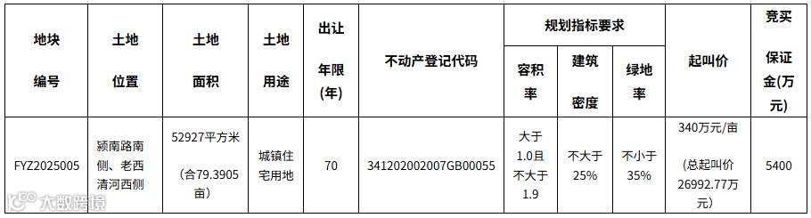 FYZ2025005号宗地要求:1.竞买人须为公司法人,不接受自然人参与竞买,不得建设别墅和私家庄园。2.竞得人在地块内配套的医疗卫生、文体、社区服务、养老服务、托育服务设施、市政公用及其配套设施竣工验收合格后,有移交规定的按规定执行,无移交规定的应无偿移交至颍州区政府指定单位。