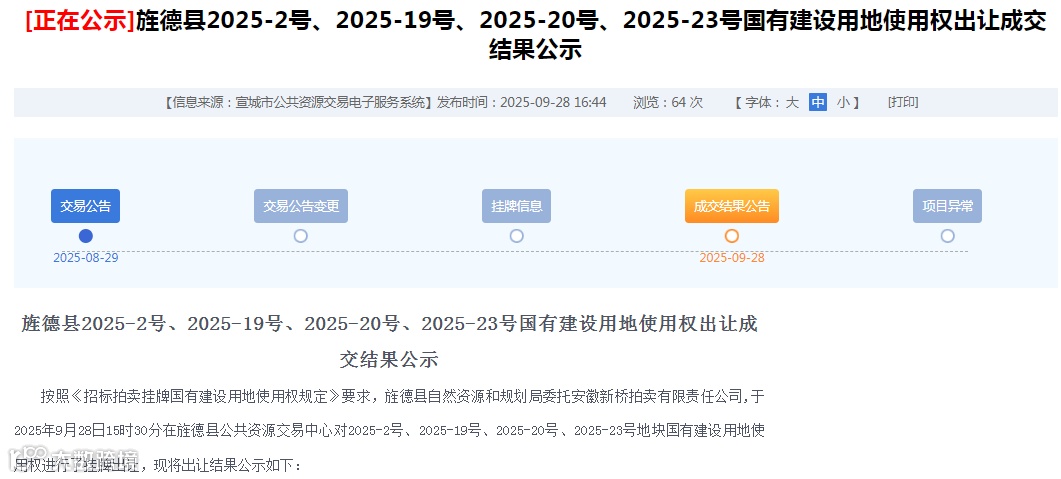 2025年9月28日,旌德县自然资源和规划局发布国有建设用地使用权出让成交结果公示,4宗优质地块成功摘牌,总成交面积超8万平方米,总成交金额近1.47亿元。此次成交地块均位于重点发展区域,涵盖居住与商业服务功能,标志着旌德县在推进城市更新、优化空间布局方面迈出实质性一步。结合《旌德县国土空间总体规划(2021—2035年)》和2025年度供地计划,这批地块的出让将进一步助力旌德县构建“美丽宜居的现代山城”,推动区域协调发展。