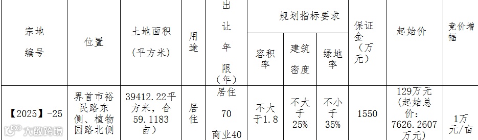 2025-23号宗地建筑高度不大于60米,商业设施占比不大于计容建筑面积的10%,其它详细指标按规划用地函【2025】27号文件执行;