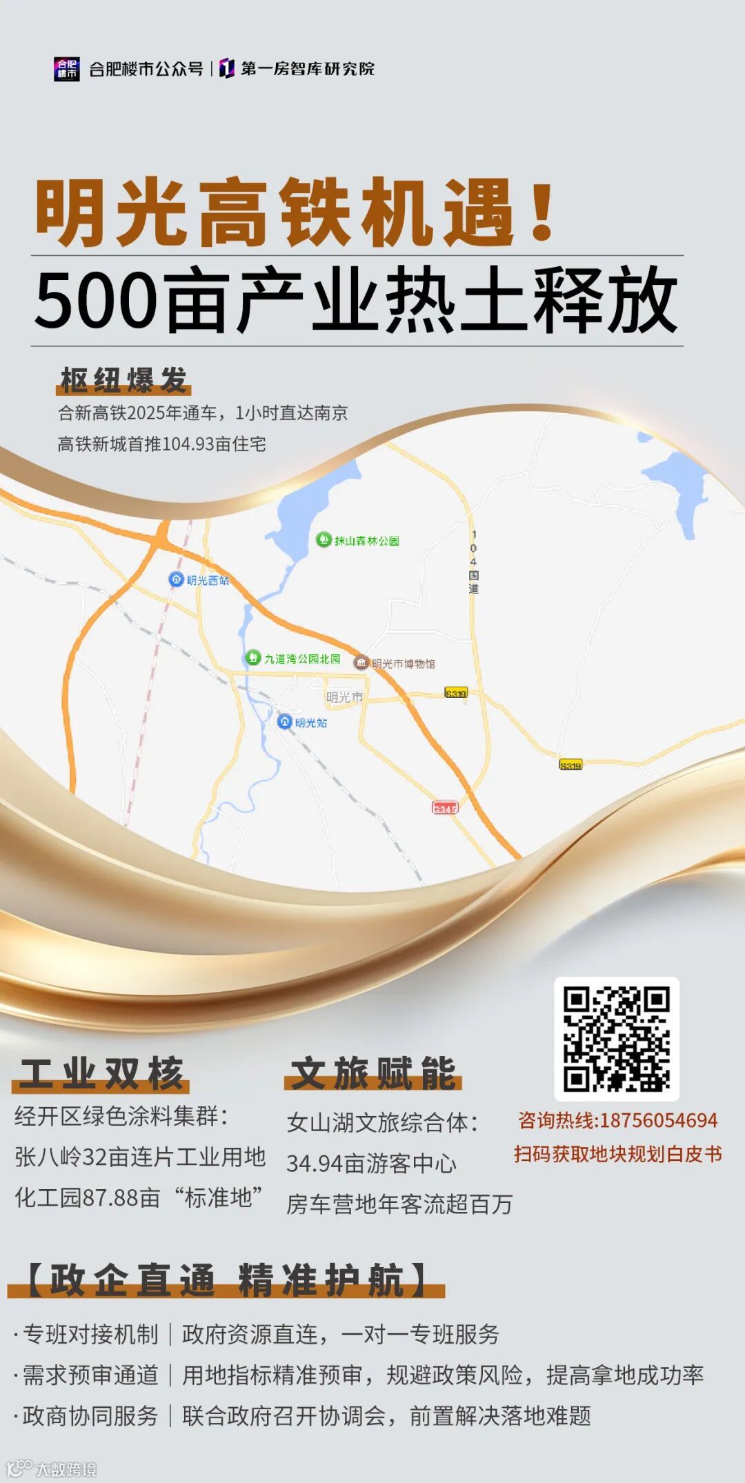 区域价值重构:参考滁州高铁站周边房价 5 年上涨 120% 的经验,明光西站辐射范围内的土地价值将迎来爆发式增长。根据 2025 年土地出让计划,站前广场周边规划商业、住宅用地,预计首批地块将于下半年挂牌。