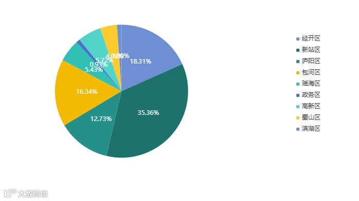 分区域来看,新站区成交面积占比35.36%,九区排名第一。经开区成交面积占比18.31%,排名第二。包河区成交面积占比16.34%,排名第三。