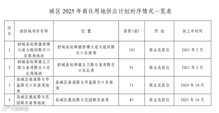 从城区2025年商住用地供应计划时序情况来看,多宗优质地块将陆续上市。如舒城县杭埠镇香樟大道与德润路交口东南角地块、杭埠镇玉兰路与姜湾路交口东北角地块,分别于2025年2月上市,面积分别为103亩和91亩;