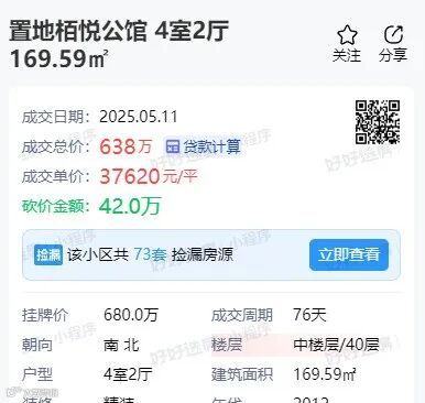 另外一套置地栢悦公馆169.59平米房源,成交总价638万,成交单价37620元/㎡。