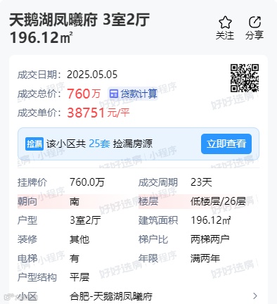 天鹅湖凤曦府小区成交一套196.12㎡房源,成交总价760万,折合单价约38751元/㎡。