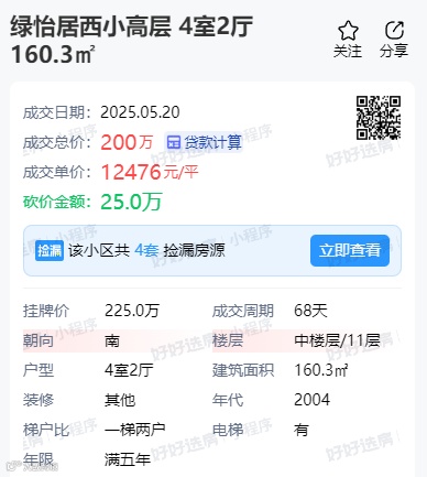 绿怡居西区一套160.3㎡小高层房源,成交总价200万,折合成交单价仅12476元/㎡。