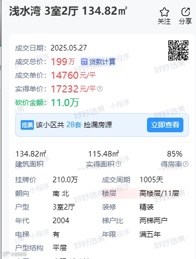 浅水湾小区一套134.82㎡房源,成交总价199万,成交单价14760元/㎡。