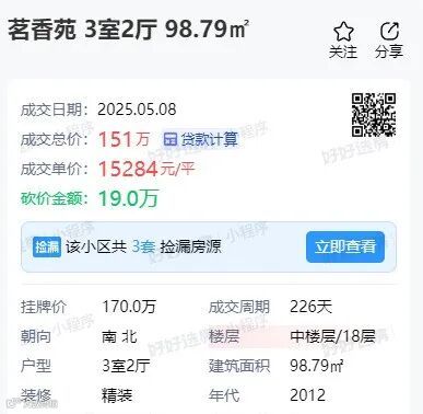 茗香苑一套98.79㎡房源,成交总价151万,成交单价15284元/㎡。
