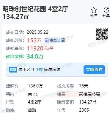明珠创世纪花园一套134.27㎡房源,成交总价152万,成交单价仅11320元/㎡。